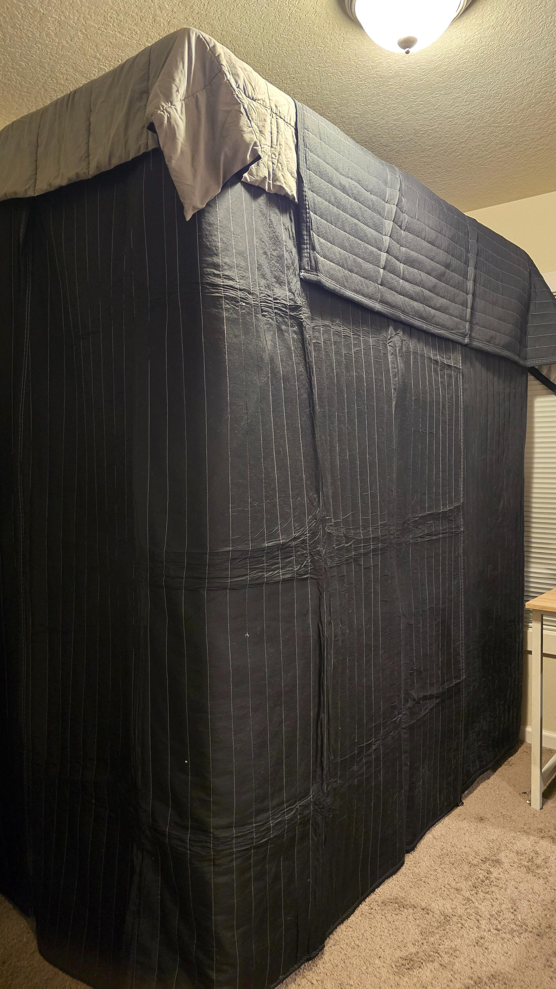 Sound Treatment: Portable vocal booth with acoustic blankets in dedicated recording space