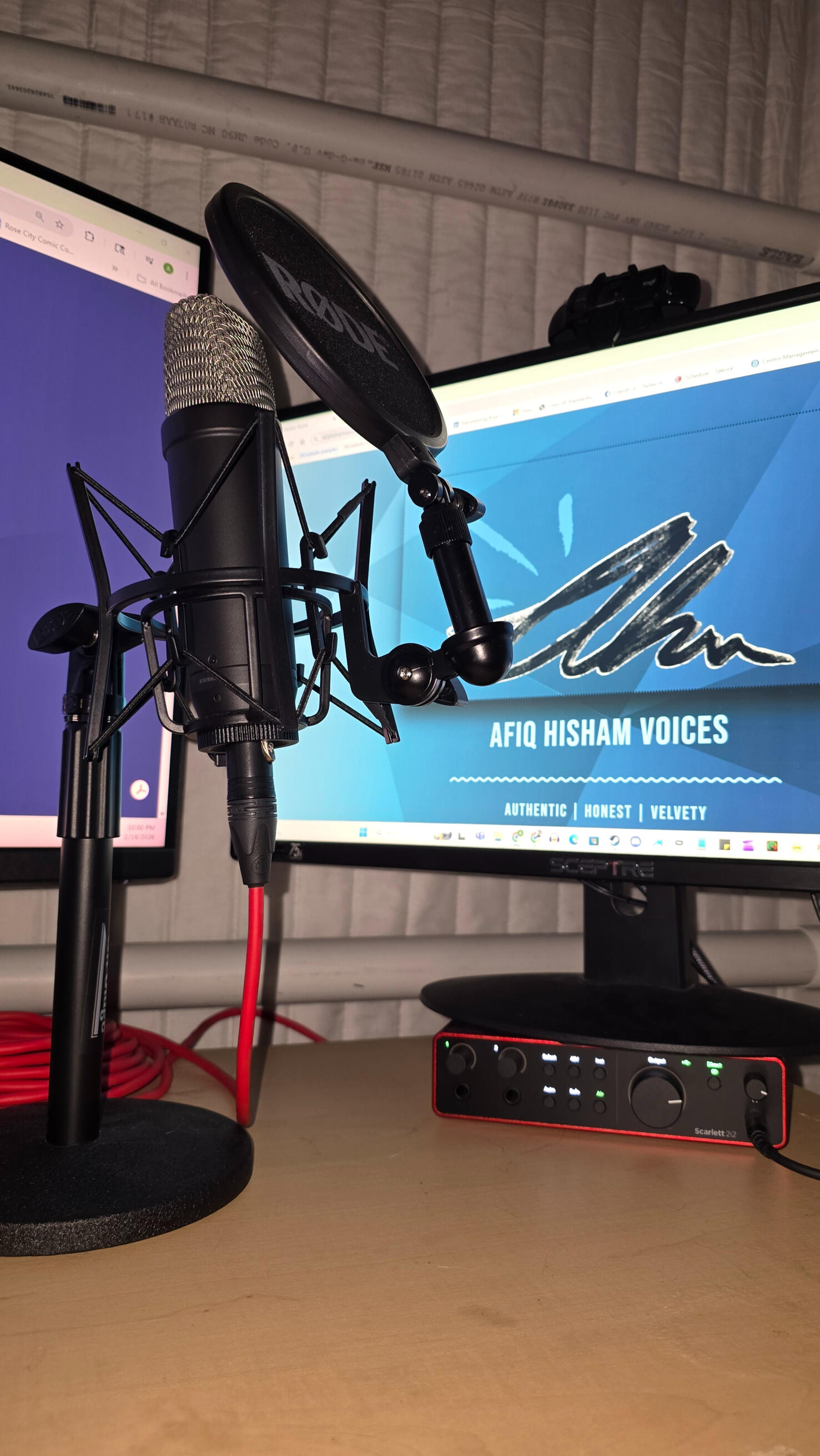 Studio Extras: RODE Pop Filter, RODE Microphone Stand, Shock Mount, Dual Monitor Setup, Mouse + Keyboard in and out of booth, HD Pro Webcam C920, Ring Light.