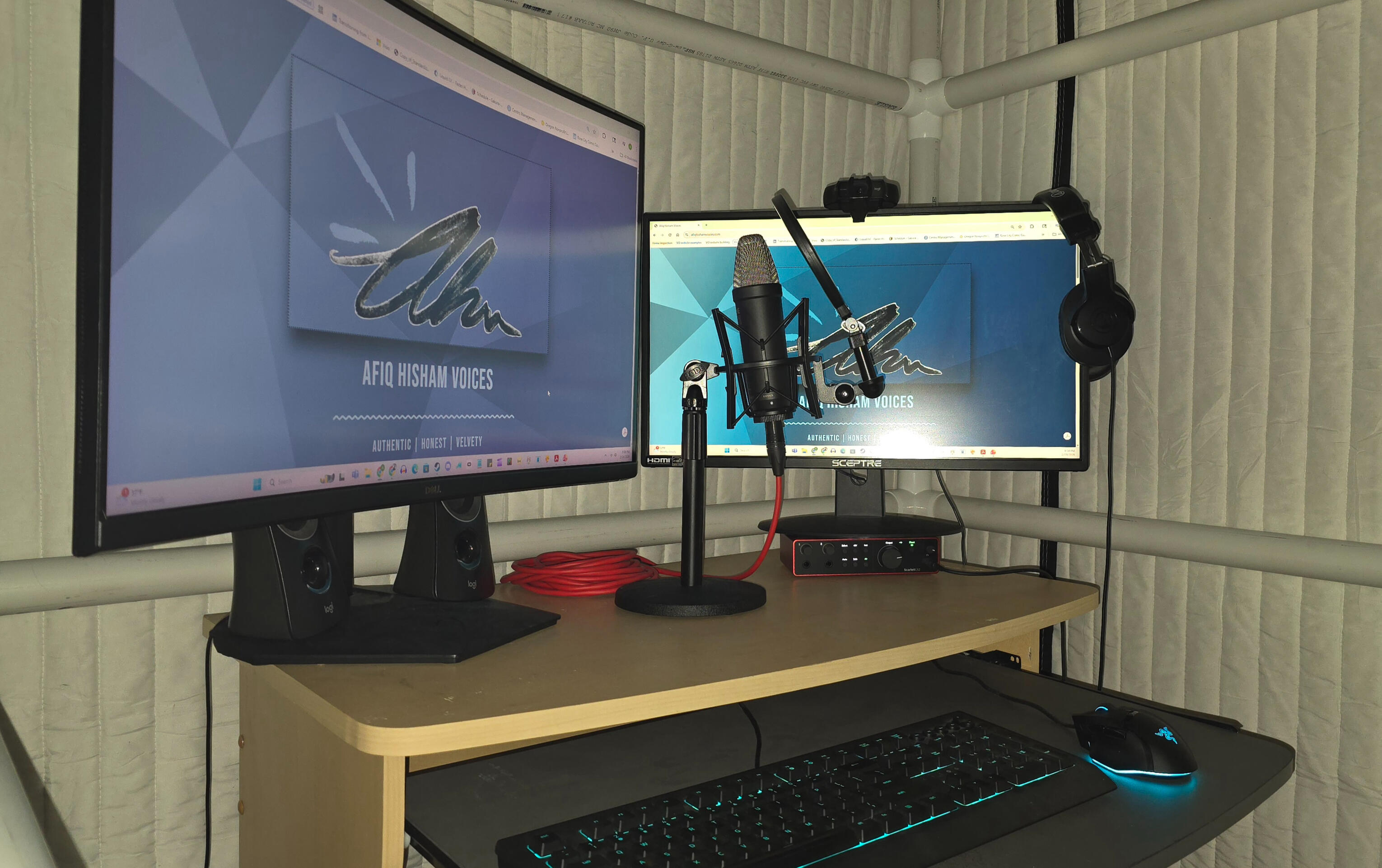 Studio Extras: RODE Pop Filter, RODE Microphone Stand, Shock Mount, Dual Monitor Setup, Mouse + Keyboard in and out of booth, HD Pro Webcam C920, Ring Light.
